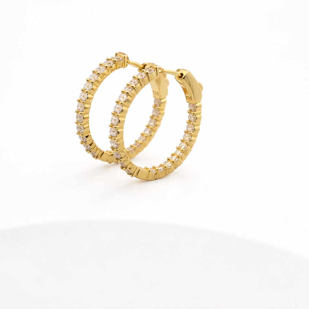 Sterling silver hinged hoop earrings featuring lab-grown moissanite stones set in an inside-out design. The 25MM (1") diameter offers a refined, wearable size that balances presence with everyday versatility. Moissanite delivers exceptional sparkle and durability—harder than diamond and resistant to clouding—while sterling silver provides a classic, hypoallergenic foundation. The hinged closure ensures secure wear and comfortable removal. An elegant choice for those seeking brilliant gemstone earrings with lasting quality.